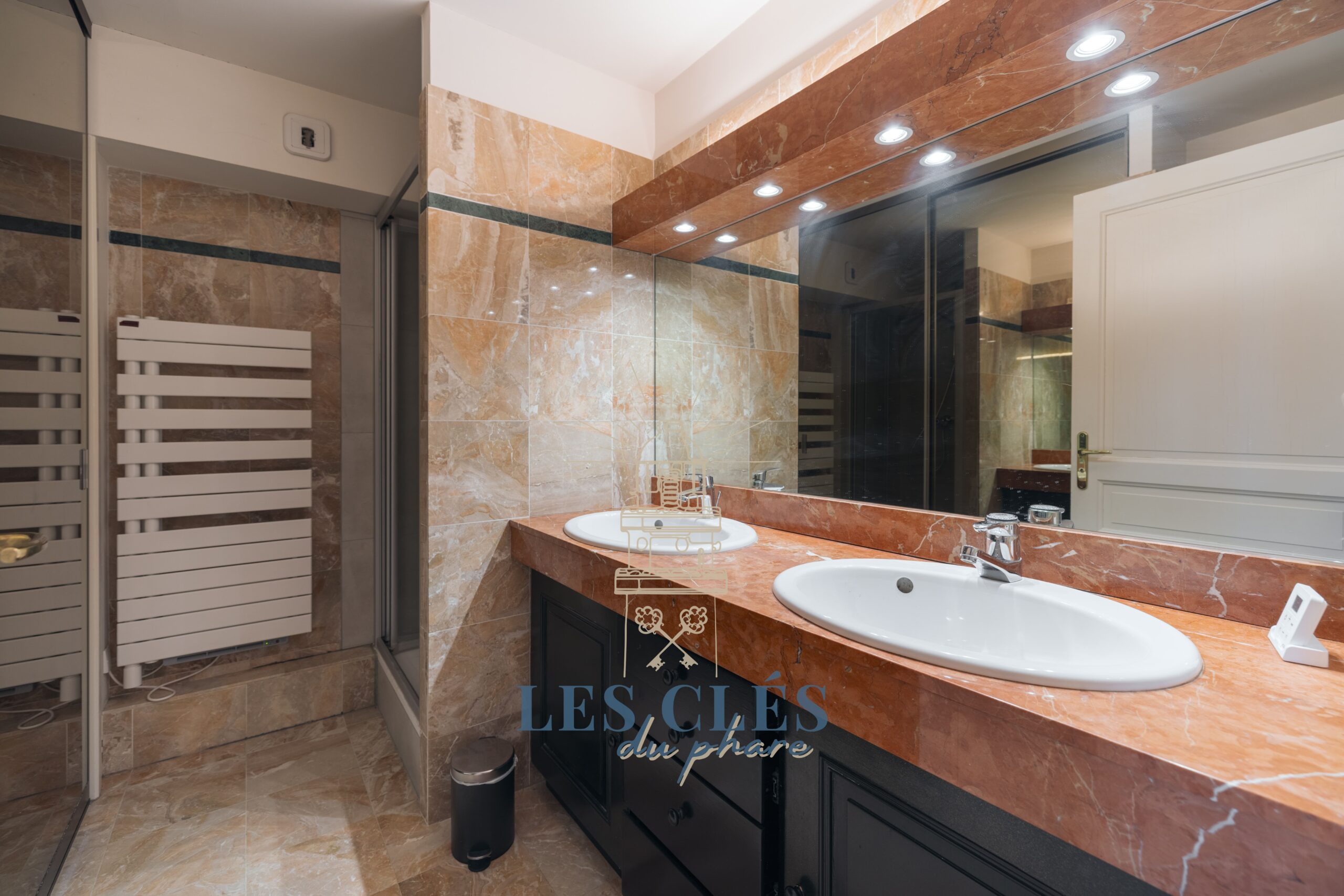 1 salle de douche avec doubles vasques.