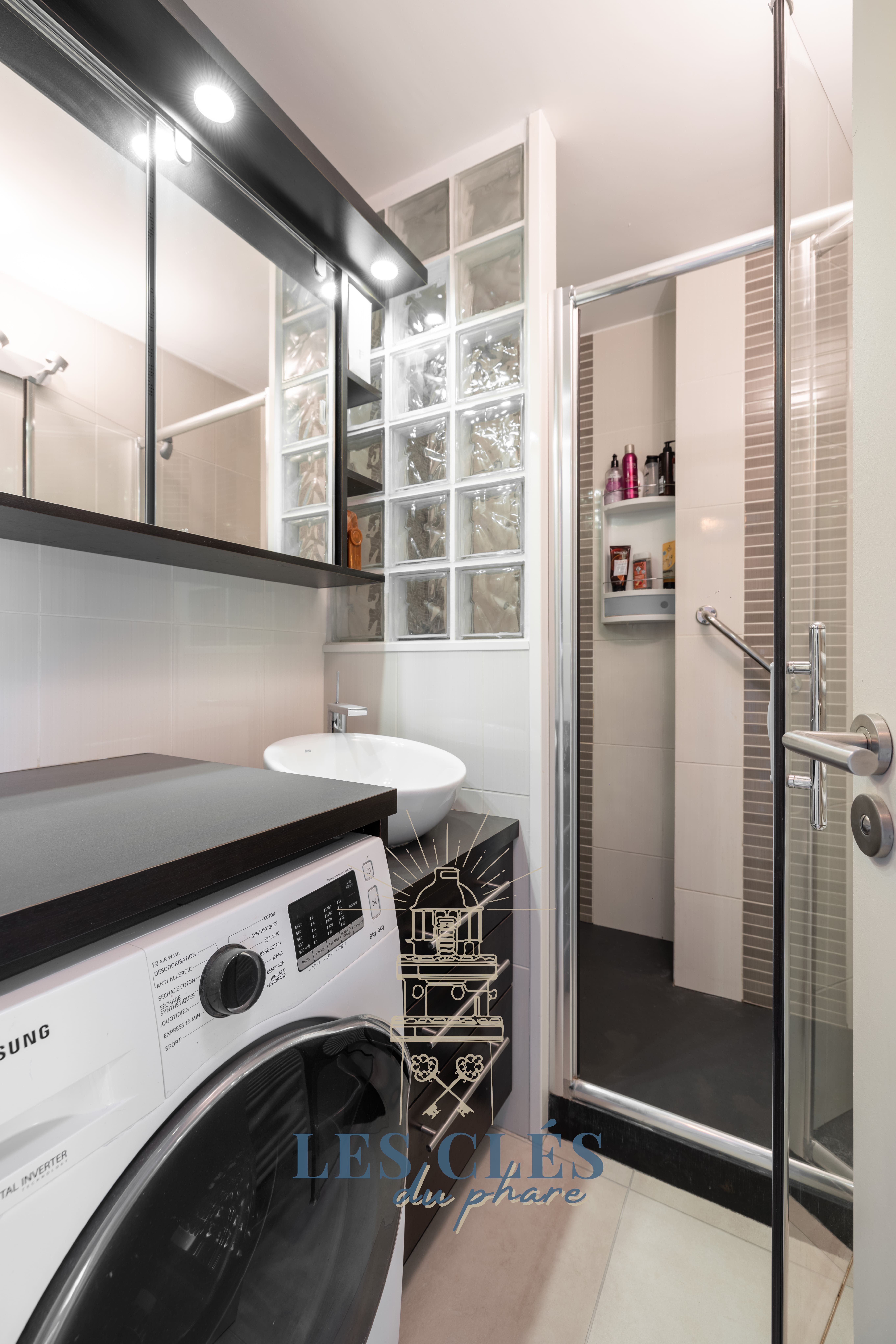 Une salle de douche avec sèche-serviette et machine à laver/séchante.
