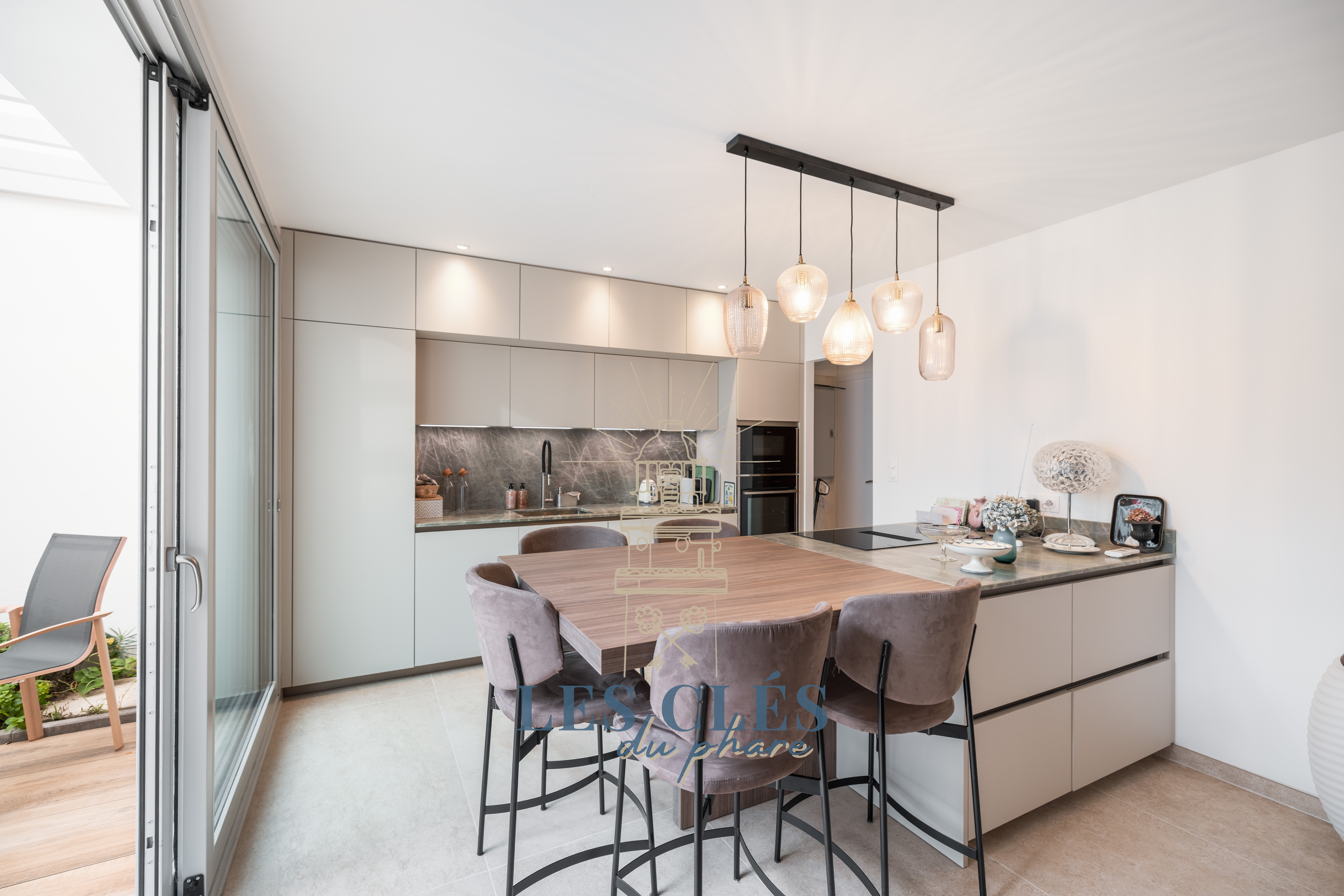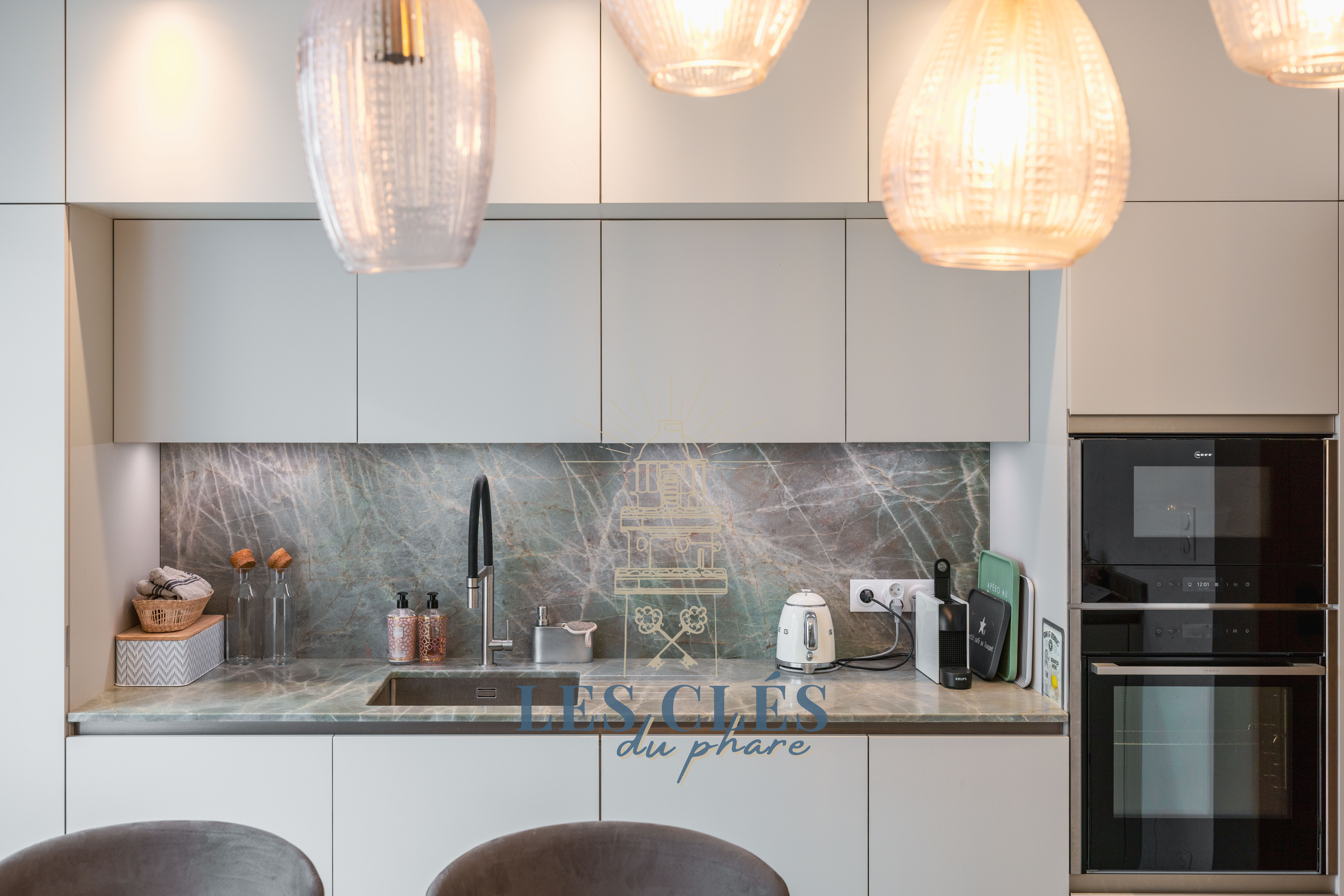 Cuisine entièrement équipée avec machine à café Nespresso, lave-vaisselle et machine à laver/séchante.