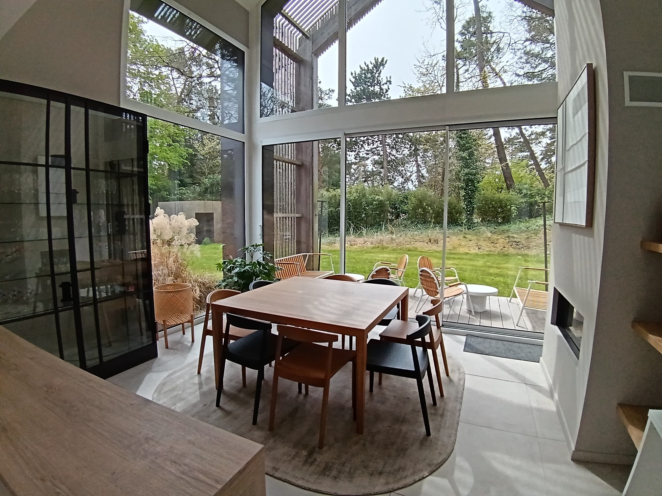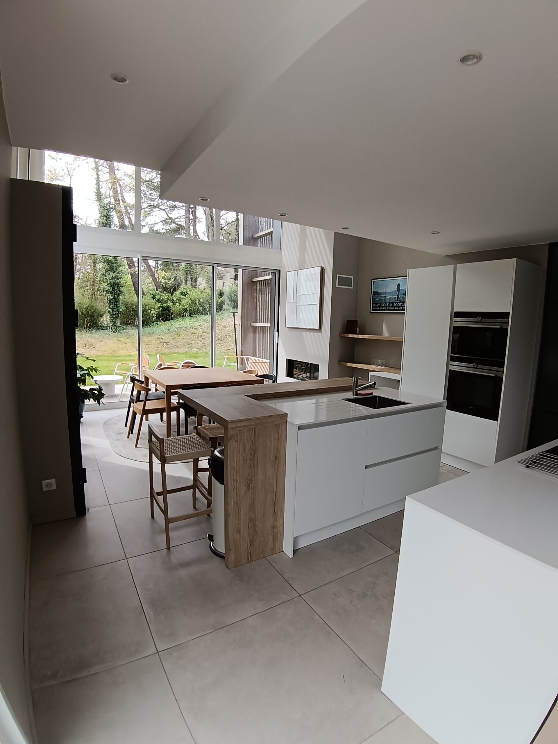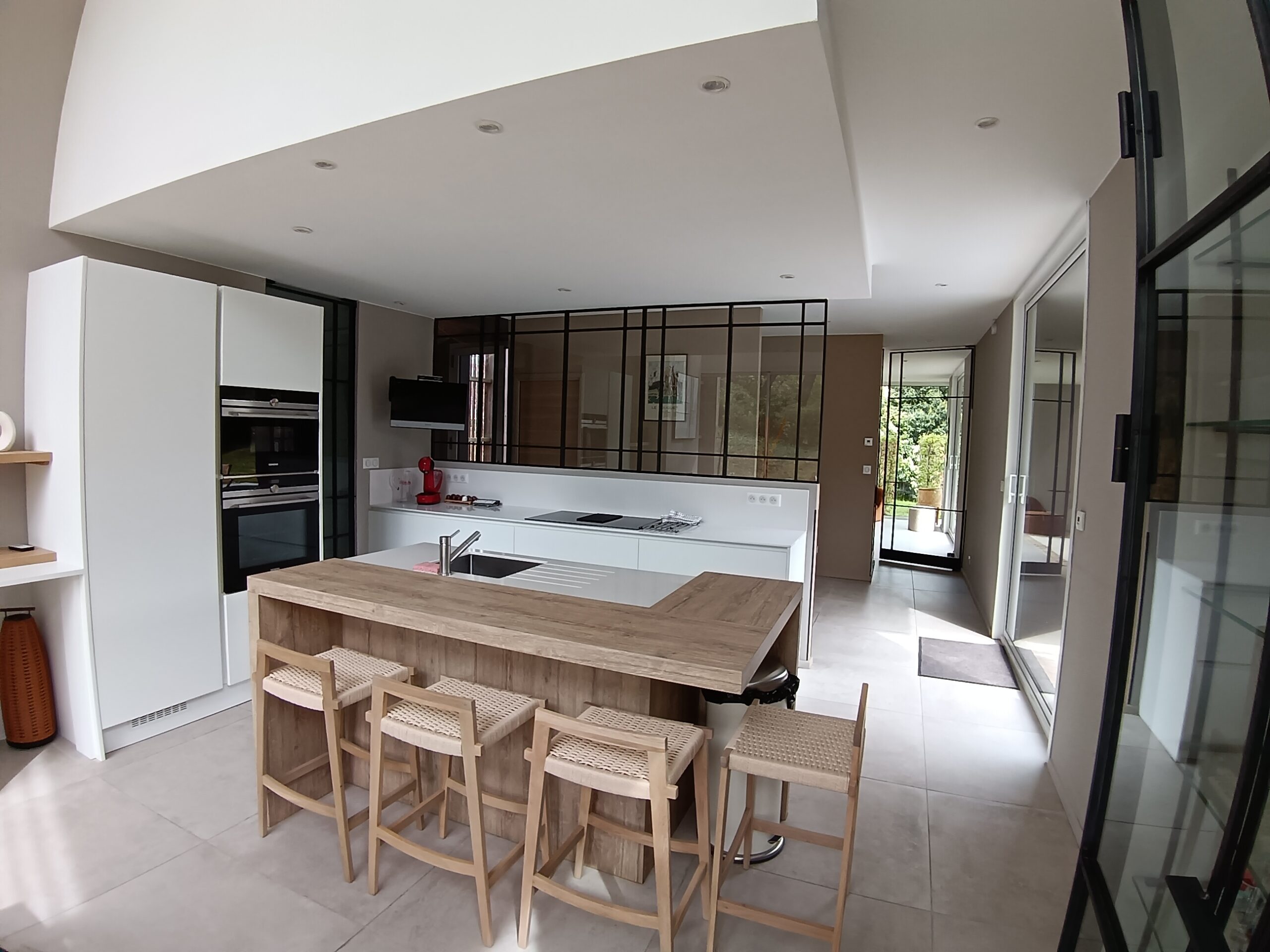 Cuisine équipée ouverte avec accès direct sur la terrasse.