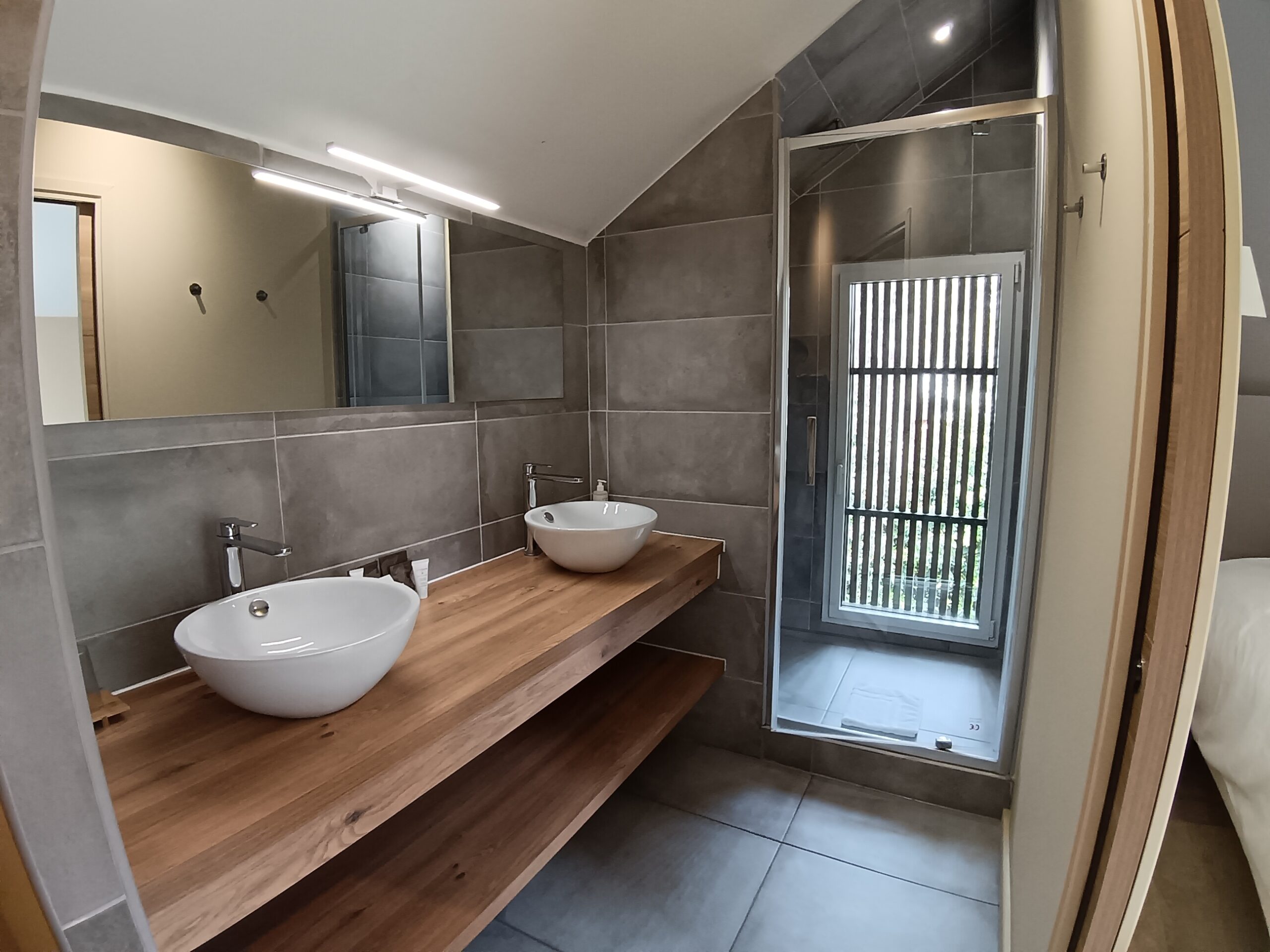 Une chambre avec 2 lits simples rapprochés avec salle de bain, douche et WC privative.