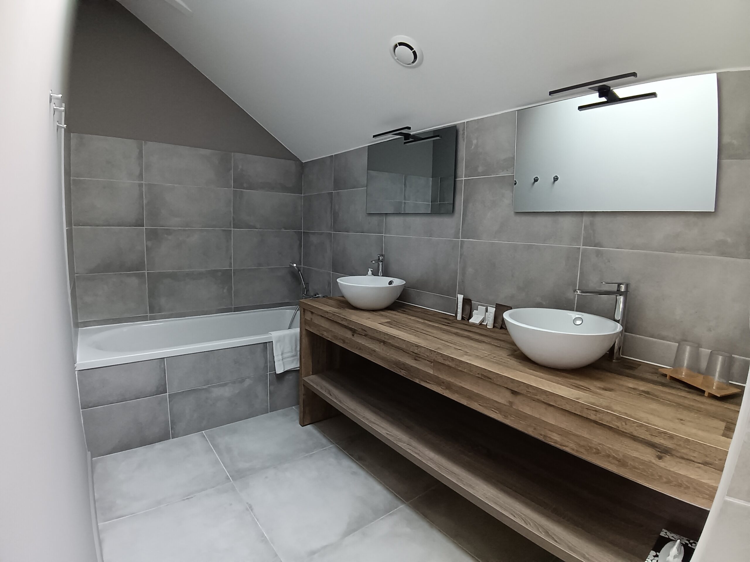 A l’étage : Une chambre avec 2 lits simples rapprochés avec salle de douche privative et WC.
