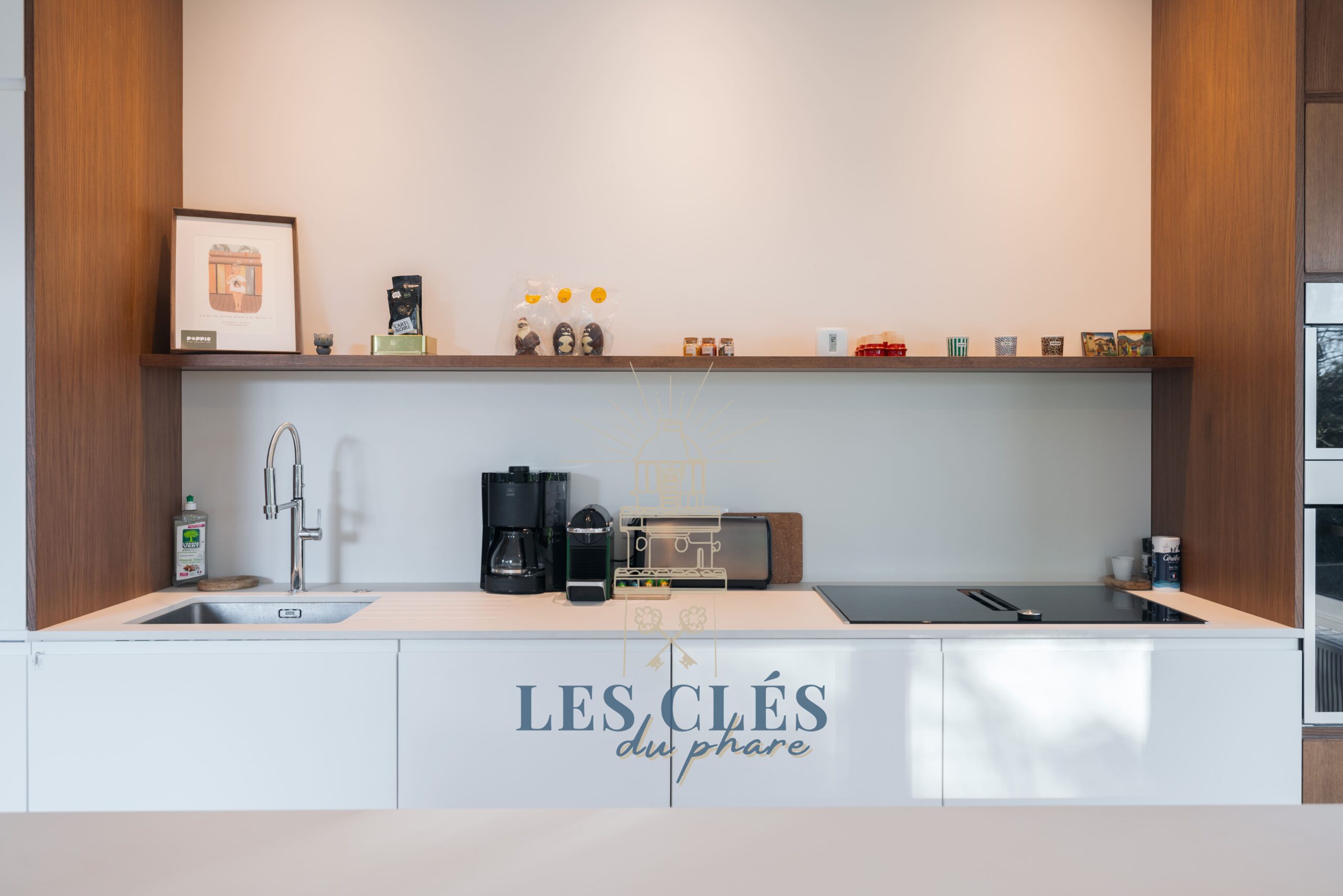 Cuisine équipée (cafetière Nespresso) ouverte sur le salon.