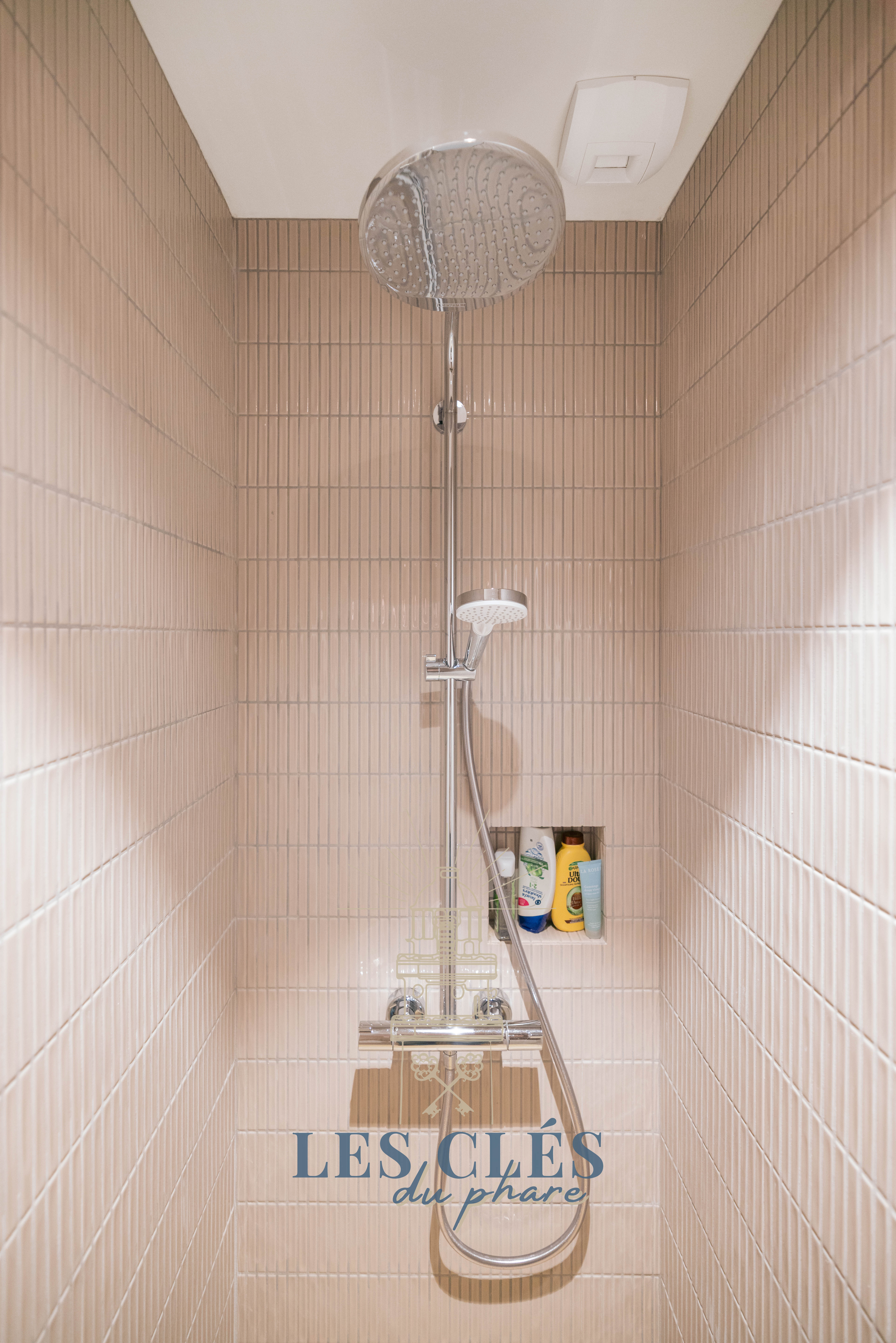 1 Chambre avec lit double (160 cm) avec salle de douche, WC et placard avec accès à une terrasse.